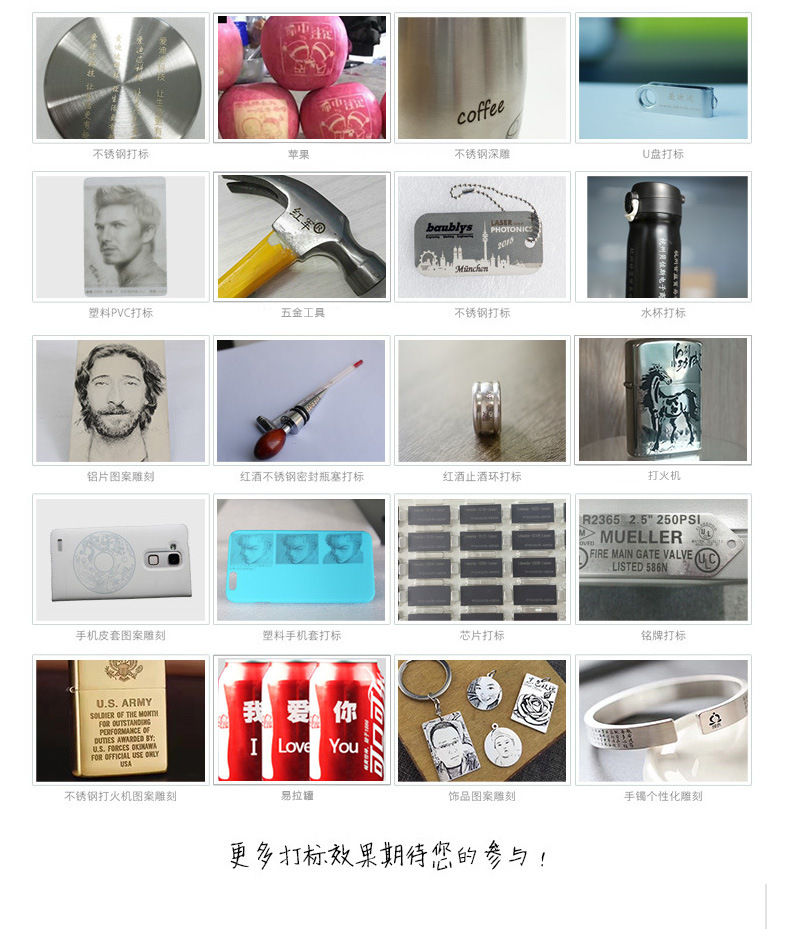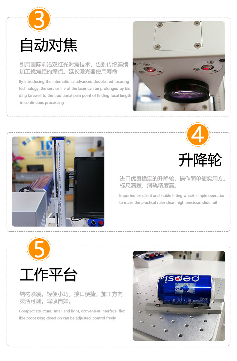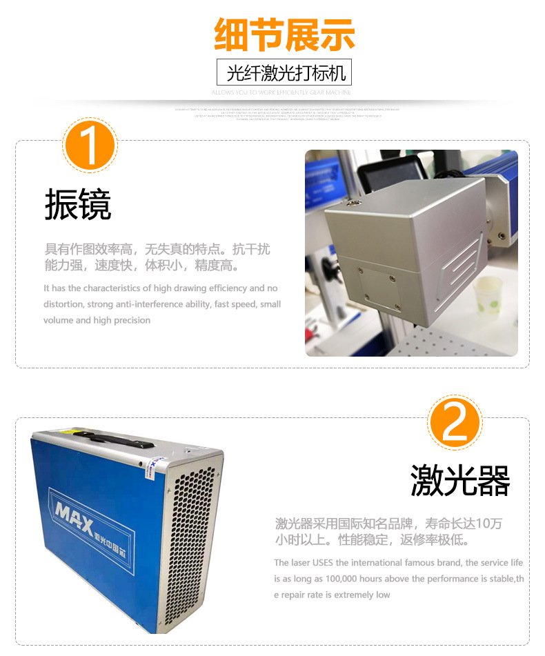 光纖激光打標(biāo)機(jī)采用光纖激光器,振鏡掃描系統(tǒng),輸出功率穩(wěn)定,光學(xué)模式好,光束質(zhì)量?jī)?yōu)異、打標(biāo)速度快,效果好,效率高,能充分滿足客戶大批量生產(chǎn)需求。